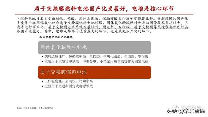 燃料电池技术主要由碱性、磷酸、固体氧化物、熔融碳酸盐和质子交换膜五种。当前我国的国产化 主要集中在固体氧化物和质子交换膜燃料电池领域。固体氧化物膜燃料电池与国外技术差距较大,且 尚未进行商业化。质子交换膜电池系统发展较好,膜电极、双极板、质子交换膜等关键零部件已经具 备国产化能力。其中,电堆是单车价值量最大的环节,也是最先国产化的环节。