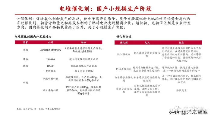 催化剂:促进氧化剂和氢气的反应,使电子离开氢原子。质子交换膜燃料电池均使用铂贵金属作为 有效催化剂,铂资源的匮乏和高成本制约了燃料电池大规模商业化。超低铂、无铂催化剂是未来研发 方向。国内催化剂产品铂载量高于国外,处于小规模生产阶段。