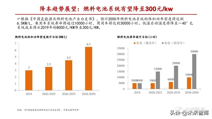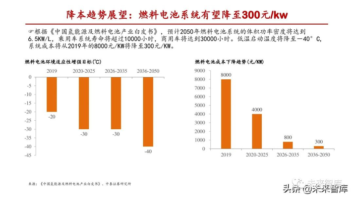 根据《中国氢能源及燃料电池产业白皮书》,预计2050年燃料电池系统的体积功率密度将达到 6.5KW/L,乘用车系统寿命将超过10000小时,商用车将达到30000小时。低温启动温度将降至-40°C, 系统成本将从2019年的8000元/KW降至300元/KW。