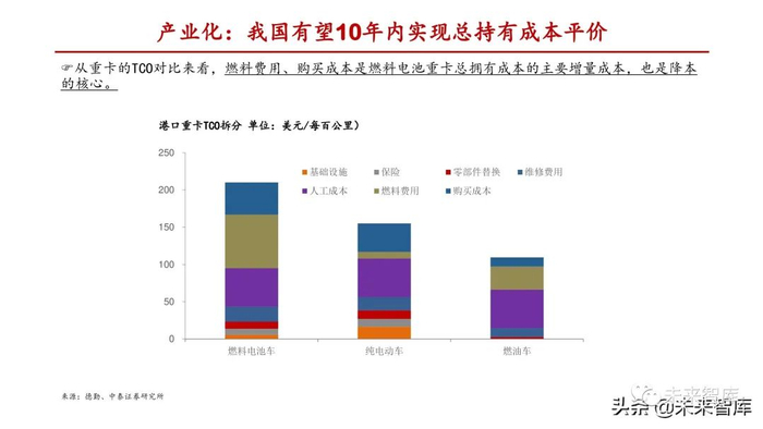 从重卡的TCO对比来看,燃料费用、购买成本是燃料电池重卡总拥有成本的主要增量成本,也是降本 的核心。