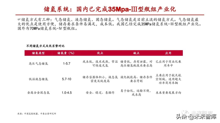 储氢方式有三种:气态储氢、液态储氢、固态储氢。气态储氢是目前主流的储氢方式。气态储氢最 大的优点是使用方便,储存要求条件易满足,成本低。我国已经完成35MPa储氢系统-Ⅲ型瓶组产业化。国外为70MPa储氢系统-Ⅳ型瓶组。