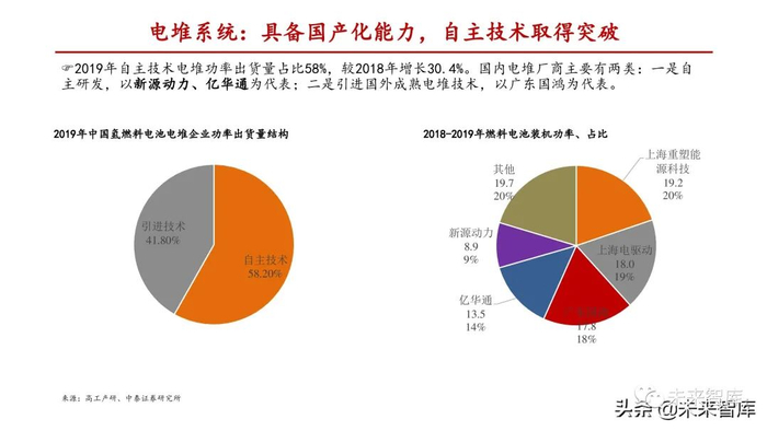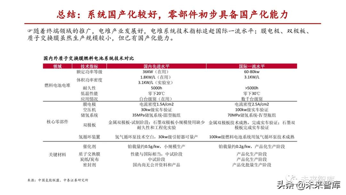 电堆系统具备国产化能力。(1)巴拉德为质子交换膜燃料电池全球龙头:19年6月公布第8代高性能 燃料电池模块FCmove-HD,获得来自意大利、荷兰多家公司的订单。18年10月公布第8代高性能液冷燃 料电池堆FCgen-LCS。(2)新源动力目前开发至第三代质子交换膜燃料电池电堆模块。