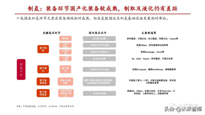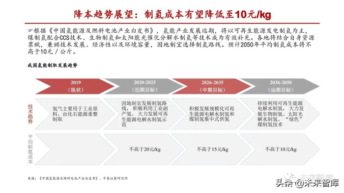根据《中国氢能源及燃料电池产业白皮书》,氢能产业发展远期,将以可再生能源发电制氢为主, 煤制氢配合CCS技术、生物制氢和太阳能光催化分解水制氢等技术成为有效补充。各地将结合自身资源禀赋,兼顾技术发展、经济性以及环境容量,因地制宜选择制氢路线。预计2050年平均制氢成本将不高于10元/公斤。