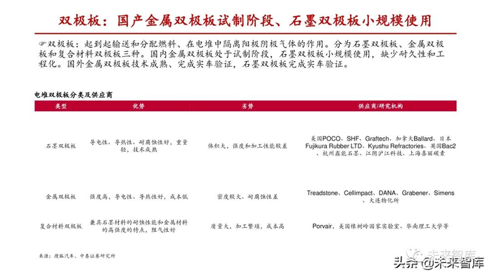 双极板:起到起输送和分配燃料、在电堆中隔离阳极阴极气体的作用。分为石墨双极板、金属双极 板和复合材料双极板三种。国内金属双极板处于试制阶段,石墨双极板小规模使用,缺少耐久性和工 程化。国外金属双极板技术成熟、完成实车验证,石墨双极板完成实车验证。