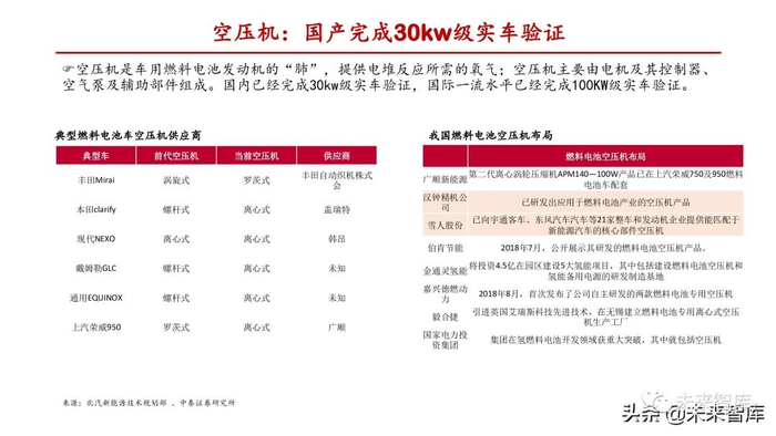 空压机是车用燃料电池发动机的“肺”,提供电堆反应所需的氧气;空压机主要由电机及其控制器、 空气泵及辅助部件组成。国内已经完成30kw级实车验证,国际一流水平已经完成100KW级实车验证。