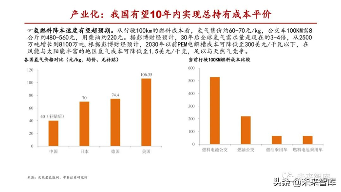 氢燃料降本速度有望超预期。从行驶100km的燃料成本看,氢气售价约60-70元/kg,公交车100KM需8 公斤约480-560元,用柴油约220元。据彭博财经预计,30年后全球氢气需求量是现在的3-4倍,从2500 万吨增长到8100万吨.根据彭博财经预计,2030年以前PEM电解槽成本可降低至300美元/千瓦以下,在 风能与太阳能丰富的地区氢气成本可降低至1.5美元/千克,足以与天然气竞争。