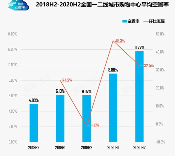 数据显示,全国19城964个样本购物中心中,2020年平均空置率为11.77%,同比涨幅高达93.9%。