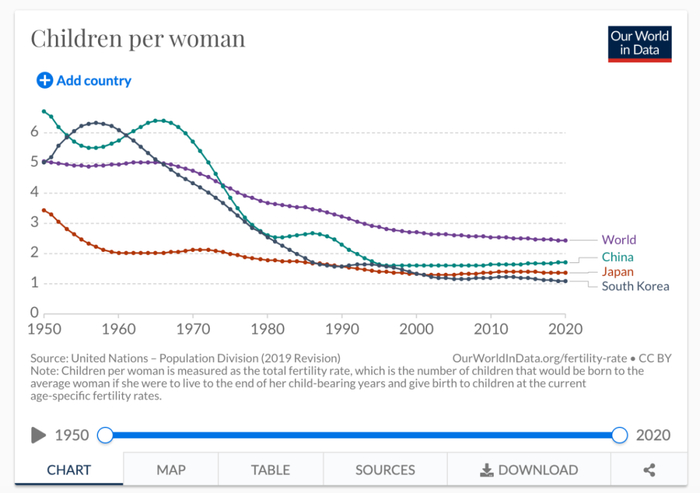 中国、日本、韩国、世界生育率变化。数据来源ourworld in data