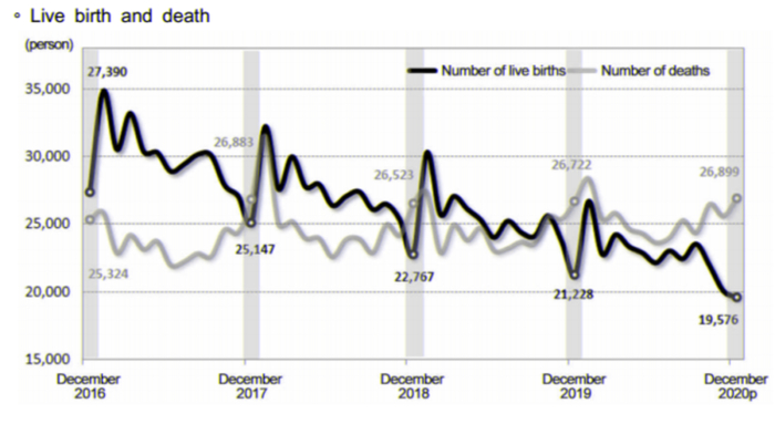 今年2月24日,韩国统计厅公布的数据显示,2020年,韩国新生儿数量为272400人,比2019年少了10%。总死亡人数则达到305100人,首次超过了新生儿数量。这也就意味着,韩国首次出现人口自然下降的现象。