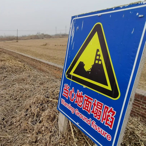 ▲武安团城东铁矿副井门外竖着“塌陷区警示牌”。新京报记者 李英强 摄
