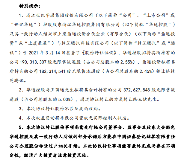 3月14日晚间,世纪华通发布公告称,控股股东华通控股及其一致行动人拟分别将持有的上市公司2.55%、2.45%股份,转让给林芝腾讯;华通控股与公司实控人王苗通拟将其合计持有的上市公司5%股份转让给公司CEO王佶;两笔交易转让价格均为7.50元/股,交易总价均约27.95亿元。