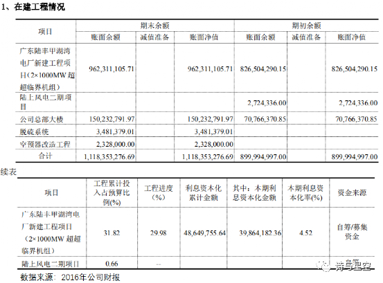 2016年年报中曾披露了甲湖湾(陆上)风电场二期工程的进展,工程计划总投资4.15亿元,实际完成进度为0.66%,没有形成固定资产,也没有继续投资。