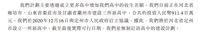 根据招股书,河北科技学院曹妃甸校区的投资额将达到11.71亿元。另据指出,其目前正在河北省廊坊、山东省枣庄市及甘肃省兰州建设高中项目,三所学校投资额累计将达到9.11亿元。