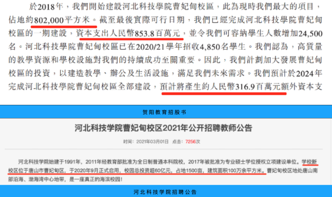 学校扩建需要配套生源的持续增加,在这个过程中,也存在“夸大宣传”的嫌疑。在河北科技学院官网,其3月1日发布的公开招聘教师公告中指出,曹妃甸校区校园总投资超60亿元,占地1500亩,换算约100万平方米。而在招股书的数据中,河北科技学院曹妃甸校区的一期建设花费8.53亿元,完成全部建设预计产生3.169亿元额外资本支出。算下来共计支出约11.7亿元。