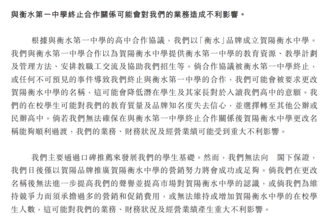 而且,从招股书看,双方签订了9年合作协议,2026年前后到期。届时,一旦衡水一中终止合作,贺阳衡水中学很有可能需要改名,这也是潜在的风险。