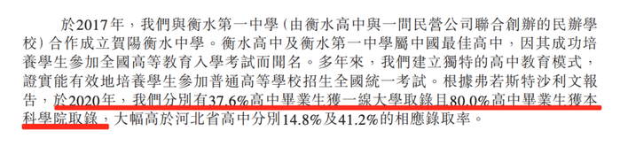 因此,贺阳衡水中学在实际的升学率远远比不上衡水中学,招股书显示,贺阳衡水中学的“一线大学录取率”为37.6%,本科学院录取率为80%。而衡水中学一本上线率常年在90%以上。
