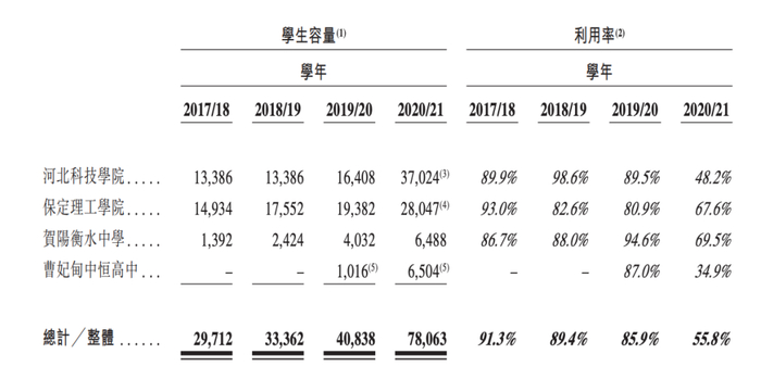 近四个学年,学校的全日制就读总人数分别为2.71万人、2.98万人、3.51万人及4.36万人,复合年增长率为17.1%。同时校园利用率在2020/2021学年降到较低水平。比如河北科技学院的利用率从2018/19学年的98.6%一路下降到48.2%。贺阳衡水中学也在扩建,从94.6%的利用率下降到69.5%。