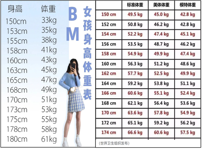 在BM女孩身材表与世界卫生组织的数据对比中,我们可以看到,160厘米身高的BM女孩竟然可以比世卫组织眼中的模特还要轻5.6公斤。