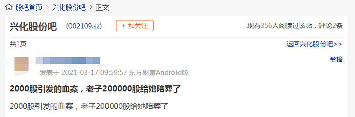 兴化股份早盘跌停,引发股吧网友热议,有网友表示,“2000股引发的血案,我200000股给她陪葬了”。有网友表示,“昨天8个点进的,给我希望了,今天只求你让我回本,小亏也走了”。