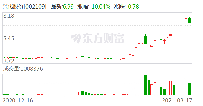 兴化股份股价自2月8日开始拉升走高,截至昨日收盘,已收获4连板,按收盘价7.77元计算,股价已涨144%。