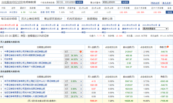 3月以来,兴化股份多次登上龙虎榜。昨日龙虎榜数据显示,买入前5席位共计买入7065.91万元,卖出前5席位共计卖出1.42亿元,其中,机构专用席位买入1343.57万元,并卖出607.97万元。