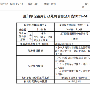 2020年12月31日,厦门国际银行北京分行因授信业务管理严重违反审慎经营规则;违规出具与事实不符的询证函回函;函证回函工作内部控制存在缺陷的违法违规行为,遭北京银保监局责令改正,并给予合计350万元罚款的行政处罚。北京银保监局对4名相关责任人罚款并予以警告,其中3人分别被罚50万元,1名被罚30万元。