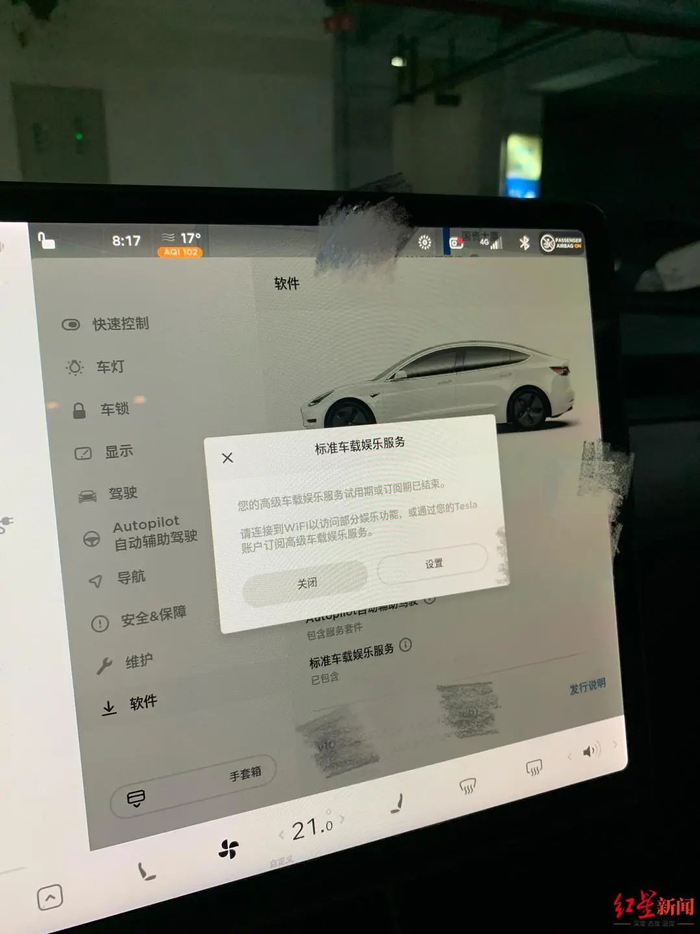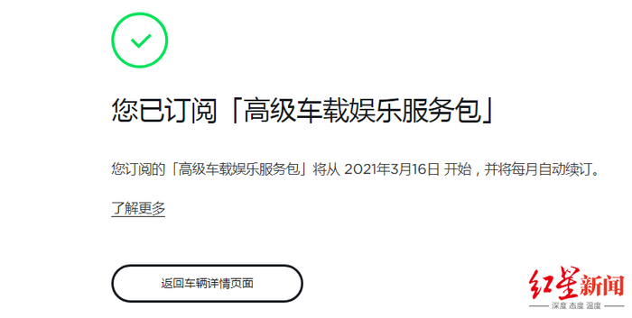 日前,有特斯拉车主向红星资本局反映,收到系统消息,说高级娱乐系统试用到期。车主只能按照提示开通一个月9.9元的包月服务,然而一开始系统显示订阅成功,却没扣款。反复操作,高级娱乐系统也无法恢复,“现在我的车载QQ音乐都没法听了。”