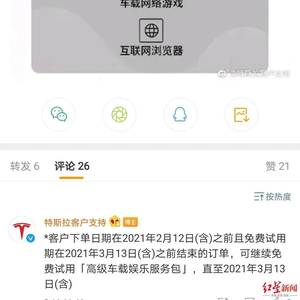 红星资本局发现,2月11日除夕夜,特斯拉官方称,高级车载娱乐服务包订阅开放,每月9.99元(含税),功能包括可视化实时路况、卫星地图等。这几天,陆续有网友表示,试用期到期了,开始准备付费。