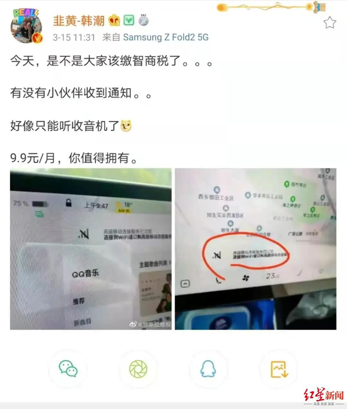 “买车的时候都是说免费的,买好了现在这些功能都开始收费了?”也有网友表示不满。特斯拉知名维权博主@韭黄-韩潮 发微博调侃,“是不是大家该缴智商税了。”