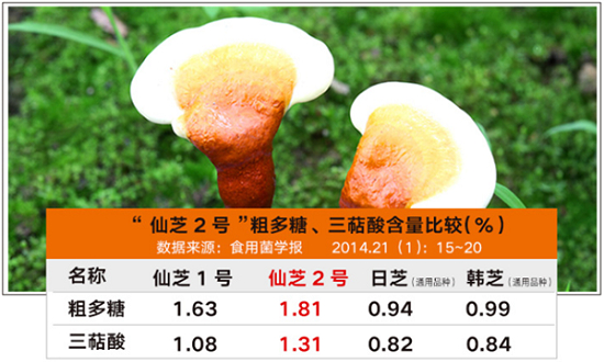 仙芝2号灵芝以20年份的原木为基质,其粗多糖和三萜酸含量分别比仙芝1号提高了11%和21%,而仙芝1号较日芝的粗多糖,三萜酸含量分别高出73.4%和31.7%,较韩芝分别高出64.6%和28.6%。灵芝多糖具有免疫调节、降血糖、降血脂、抗氧化、抗衰老及抗肿瘤作用;三萜类化合物能净化血液,保护肝功能。
