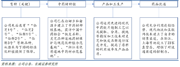 公司已形成灵芝和铁皮石斛等系列产品的“全产业链”发展模式,打通了育种、中药材种植、产品加工生产到渠道销售四个环节,建立了一定的优势。