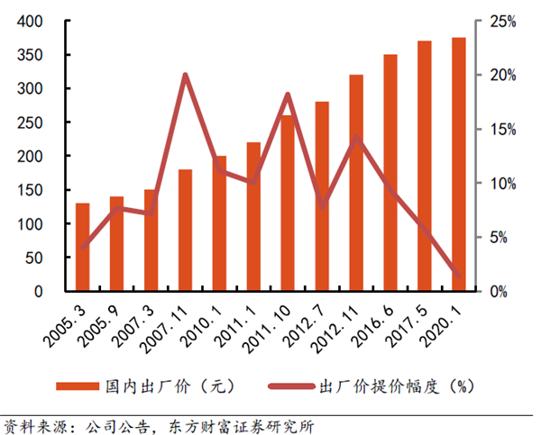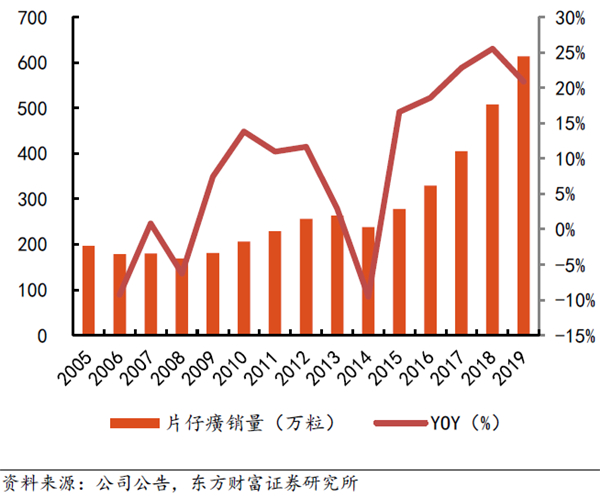2016-2019年片仔癀系列产品营业收入由11.03亿元增长至22.72亿元,CAGR达27.27%;期间出厂价上提3次,年均提价5.43%,提价幅度较为温和;销量由2016年的329万粒增长至2019年的614万粒,年均增速高达23%,主要系公司持续推进体验馆渠道建设及一核两翼战略带动终端销量快速增加。本轮业绩增长中提价相对谨慎,终端销量增长的贡献比重高达80%。