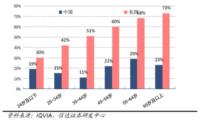 中美各年龄段保健品渗透率对比(%):