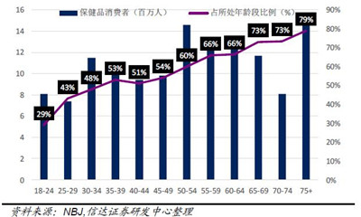 CRN统计的美国保健品渗透率由2008年的64%上升至2017年的76%;而根据艾昆伟咨询,截止2018年,我国保健品渗透率仅为20%,且据前瞻产业研究院的调查数据显示,中国消费市场以老年人消费为主,40岁以下的中青年仅占23%。对比中美保健品消费结构可以发现,中国保健品渗透率仅为美国的1/3,增长空间巨大。