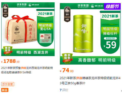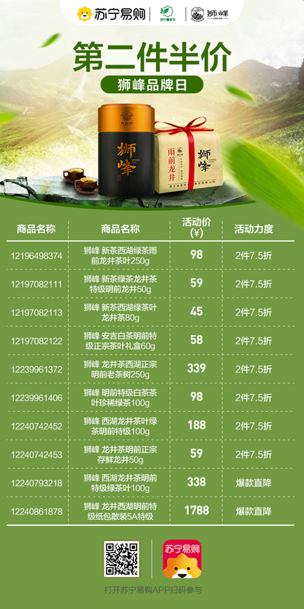 3月17日,苏宁易购签约浙茶集团,上线狮峰系列茶品福利活动。最诱人的活动,就是明前5A特级茶叶爆款直降。比如,西湖龙井绿茶明前特级100g仅需188元,比原价降了80元,购两件还可享9折叠加优惠。这款茶值得入手。