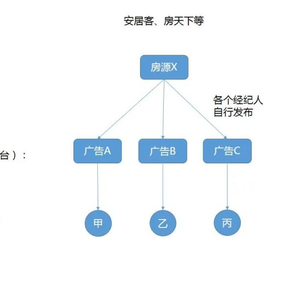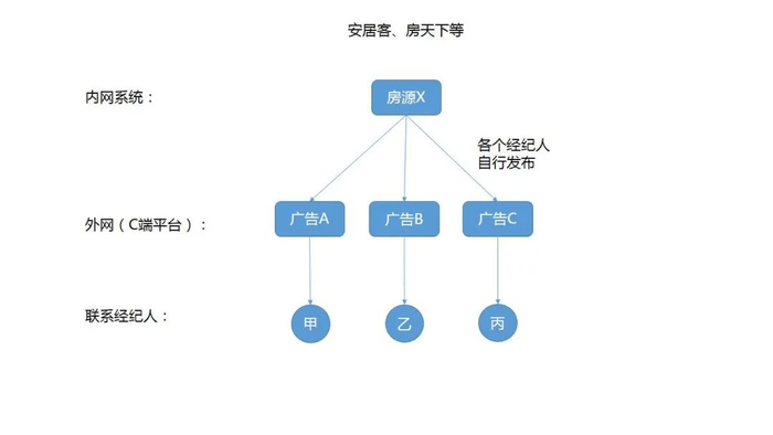 主流流量平台(58、安居客、房天下等)的商业模式是卖广告,根据房源信息的展示和点击来收取广告费。这种模式下,广告(房源信息)的量越大则会为平台贡献更多的收入,从KPI导向上,就容易引导经纪人去发更多的房源,做更多的推广。而流量平台从产品设计上就没有把广告和房源实体做唯一性的关联(数据结构如下图示意),