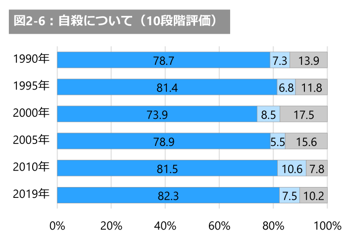 日本人对自杀依然持强烈的批判观点,82.3%的日本人都不支持自杀之举。