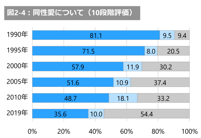 54.4%的日本人认为同性恋没啥问题,不接受同性恋的只有35.6%。