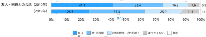 最后一个有趣的数据是,日本人和朋友同事聊新闻时事的频率开始下降。自2010至2019年间,每天和朋友同事聊新闻的人下降了15.8%。而与此同时,使用互联网看新闻的人却上升了24.6%。
