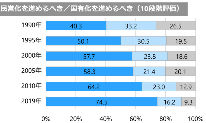 关于企业,更应该推进国有化还是私有化?日本人的答案非常明显,30年来,日本人越来越推崇私有化,支持国有化的连10%都不到了。日本人对政府的警惕与不信任可见一斑。