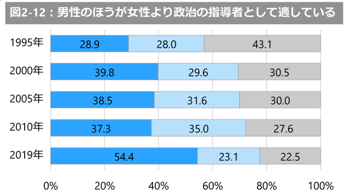 “男性比女性更适合当政治家吗?” 54.4%的日本人反对这种说法。