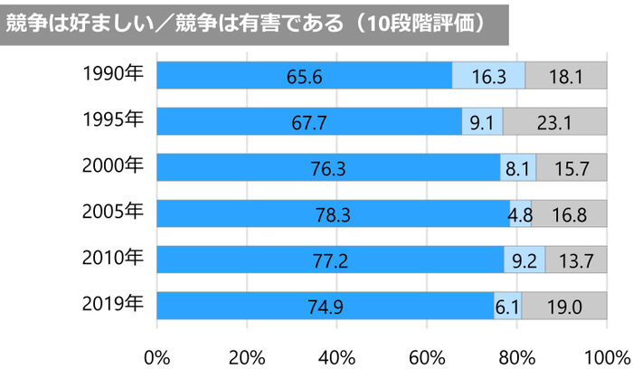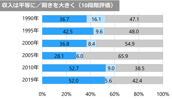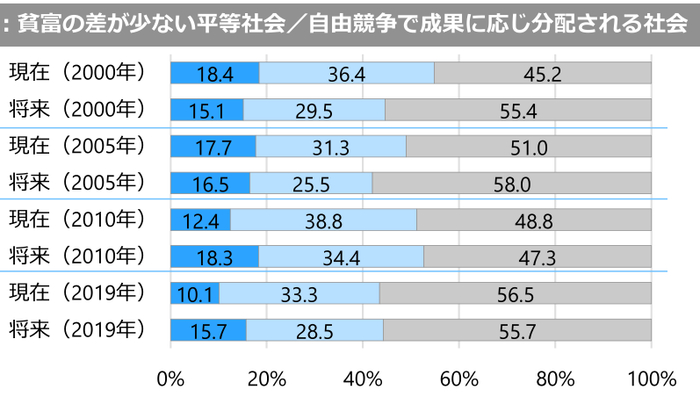 超过一半的日本人更想要一个有竞争性、自己努力自己享受的社会,而不是一个贫富差距小的平等型社会。