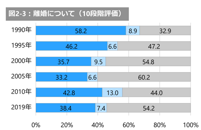 对离婚持负面评价的日本人有38.4%,认可的有54.2%。