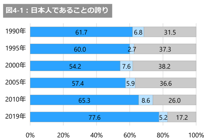 这个问题是“你作为日本人感到骄傲吗?”77.6%的日本人感到骄傲,史上最高。