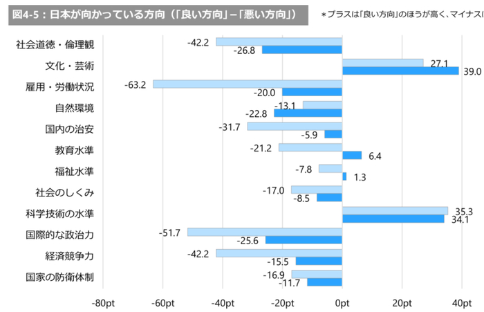可以清晰发现,日本人觉得日本只有“文化艺术”和“科学技术水准”在向好的方向发展,而其它几乎所有方面,无论是道德、经济、环境、治安甚至国防,都在向不好的方向发展。