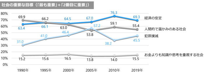 这是日本人眼中社会最重要的目标,第一位是“经济安定”,第二位是“有人性温暖的社会”,第三位是“消灭犯罪”,第四位是“比起金钱更重视思考”。