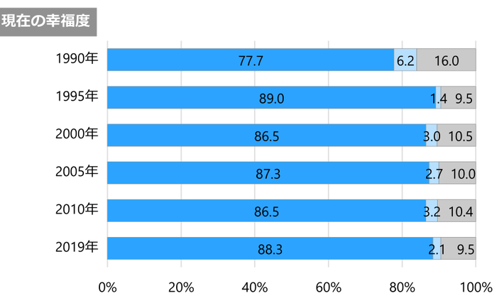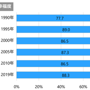 2019年,有88.3%的日本人认为自己生活得“幸福”。认为自己生活不够幸福的,只有9.5%。