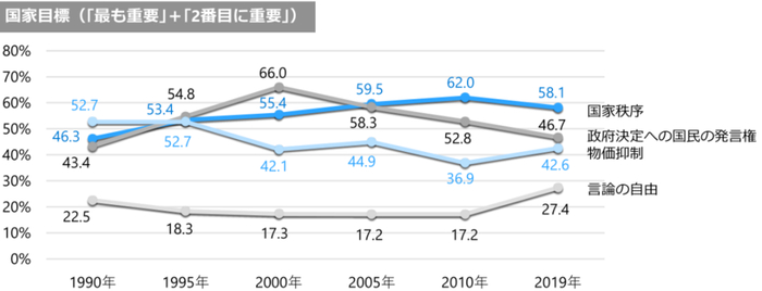 这是日本人眼中国家最重要的目标,第一位是“国家秩序”,第二位是“国民在政府决定方面有发言权”,第三位是“抑制物价”,第四位是“言论自由”。