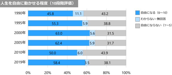 58.4%的日本人认为自己的人生比较自由,38.1%的人认为自己不够自由。