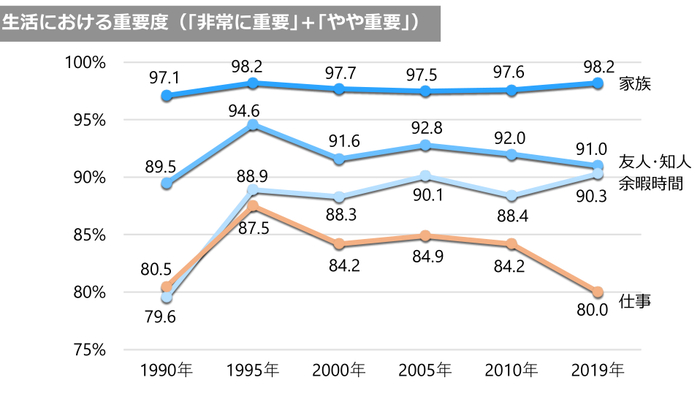 自1995年,日本人首次认为闲暇时间比工作更重要后,2019年,闲暇时间的重要程度甚至即将超越“朋友和熟人”,即将成为日本人生活中第二重要的事物。最重要的当然还是家庭,最不重要且下跌速度飞快的,是工作。